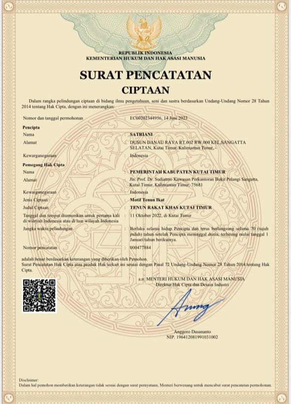 SAMARINDA – Berkat keseriusan Pemerintahan Kabupaten Kutai Timur (Pemkab Kutim ) dalam mendukung produk, Selasa (20/06/2023) menjadi sejarah bagi Kabupaten Kutai Timur. Sebab, Tenun Rakat khas Kutai Timur (Kutim) berhasil mendapatkan Sertifikat Kekayaan Intelektual Komunal (KIK) dari Kantor Wilayah Kementerian Hukum dan HAM, Kalimantan Timur. (Kaltim)